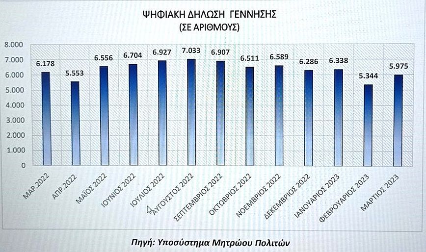 Στο γράφημα φαίνονται οι ψηφιακές δηλώσεις γέννησης κατά το χρονικό διάστημα Μαρτίου 2022 – Μαρτίου 2023.