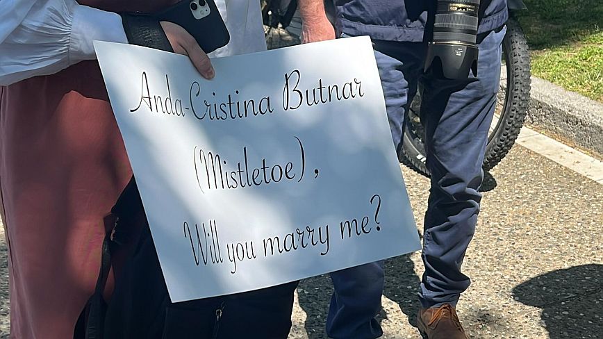 Ο 34χρονος Κωνσταντίνος Λωλάκος εμφανίστηκε στο τέλος της διαδρομής με ένα πλακάτ που έγραφε «Anda Cristina Butnar, will you marry me?».