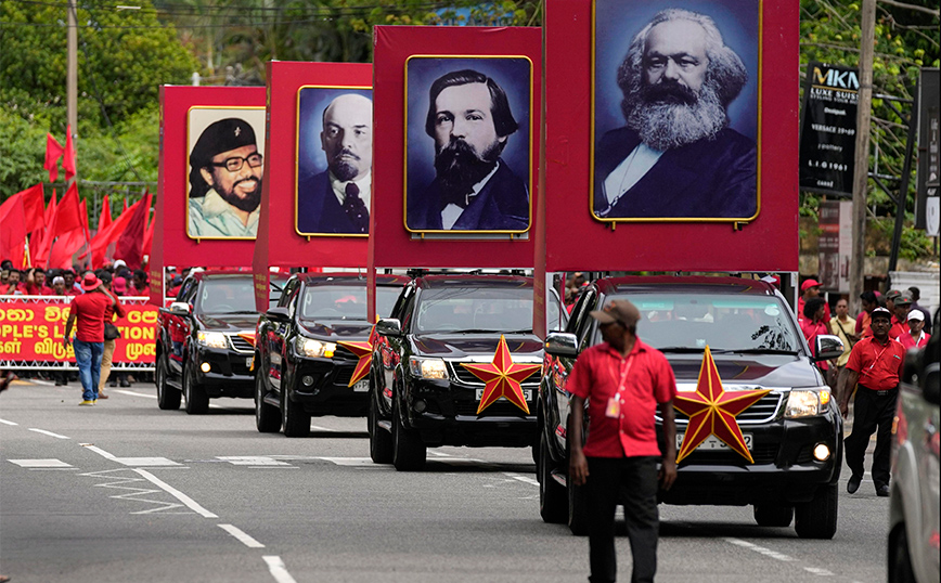 Τα πορτρέτα σπουδαίων κομμουνιστών των Karl Marx, Friedrich Engels, Vladimir Lenin και Rohana Wijeweera, μεταφέρονται σε οχήματα κατά τη διάρκεια μιας συγκέντρωσης που διοργανώθηκε από το People’s Liberation Front, ένα μαρξιστικό πολιτικό κόμμα, για τον εορτασμό της Πρωτομαγιάς στο Κολόμπο της Σρι Λάνκα.