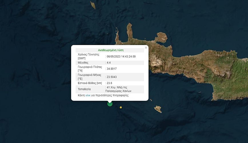 Σεισμός 4,4 Ρίχτερ σημειώθηκε το απόγευμα του Σαββάτου (6/5) στην Κρήτη. Το επίκεντρο ήταν σε θαλάσσια περιοχή, ανοιχτά των Χανίων.