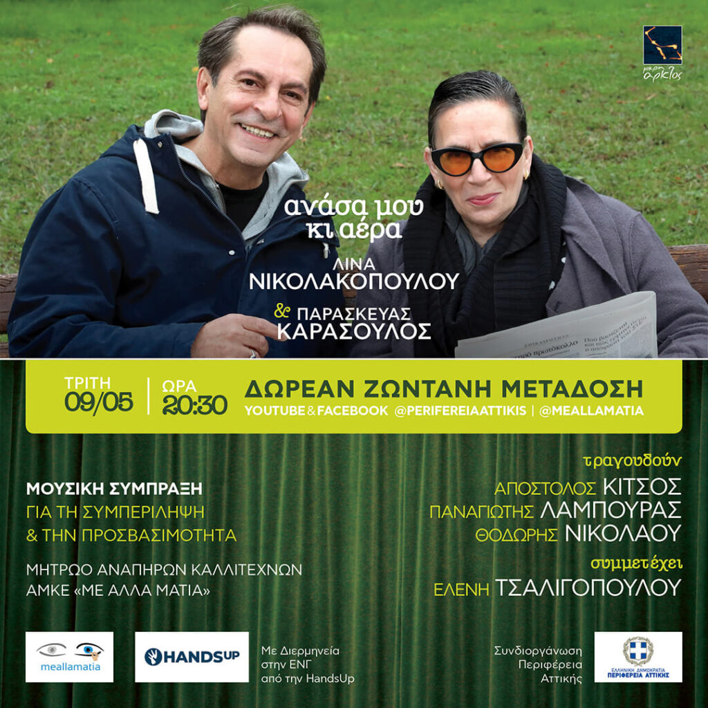 Την Τρίτη 9 Μαΐου στις 20:30 θα μεταδοθεί στο Facebook & το Youtube του meallamatia.gr ή στα social media της Περιφέρειας Αττικής η παράσταση «Ανάσα μου κι αέρα», μια σύμπραξη καλλιτεχνών με και χωρίς αναπηρία που θα αποτελέσει ύμνο συμπερίληψης και προσβασιμότητας.