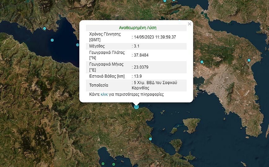 Σεισμική δόνηση μεγέθους 3,1 βαθμών της κλίμακας Ρίχτερ σημειώθηκε το μεσημέρι της Κυριακής στην Κόρινθο, σύμφωνα με το Γεωδυναμικό Ινστιτούτο του Εθνικού Αστεροσκοπείου Αθηνών.