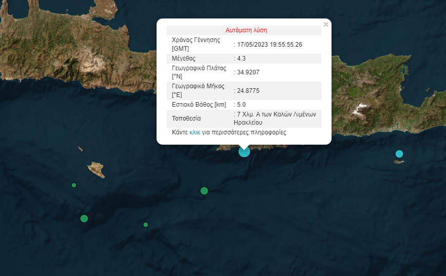 Σεισμός σημειώθηκε πριν λίγα λεπτά στην Κρήτη. Ο σεισμός έγινε στις 22:55 και το επίκεντρο του εντοπίστηκε στα 7 χιλιόμετρα ανατολικά των Καλών Λιμένων Ηρακλείου.