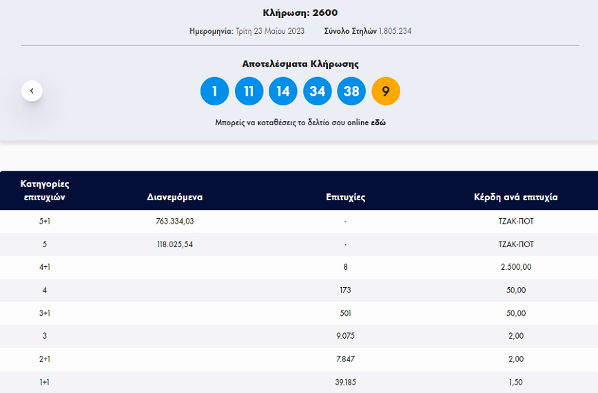 Οι τυχεροί αριθμοί λοιπόν, στη σημερινή κλήρωση Τζόκερ είναι οι εξής: 1, 11, 14, 34, 38 και Τζόκερ το 9.