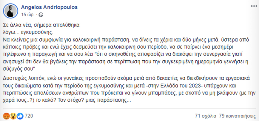 Μέσα από τον προσωπικό του λογαριασμό στο Facebook, ο ταλαντούχος ηθοποιός κατήγγειλε πως σκηνοθέτης τον απέλυσε από καλοκαιρινή θεατρική παράσταση, λόγω του ότι η γυναίκα του είναι έγκυος. Η δημοσίευσή του ξεσήκωσε θύελλα αντιδράσεων στο μέσο κοινωνικής δικτύωσης, ενώ πολλοί είναι εκείνοι που του αναφέρουν να απευθυνθεί στο Σωματείο Ελλήνων Ηθοποιών.