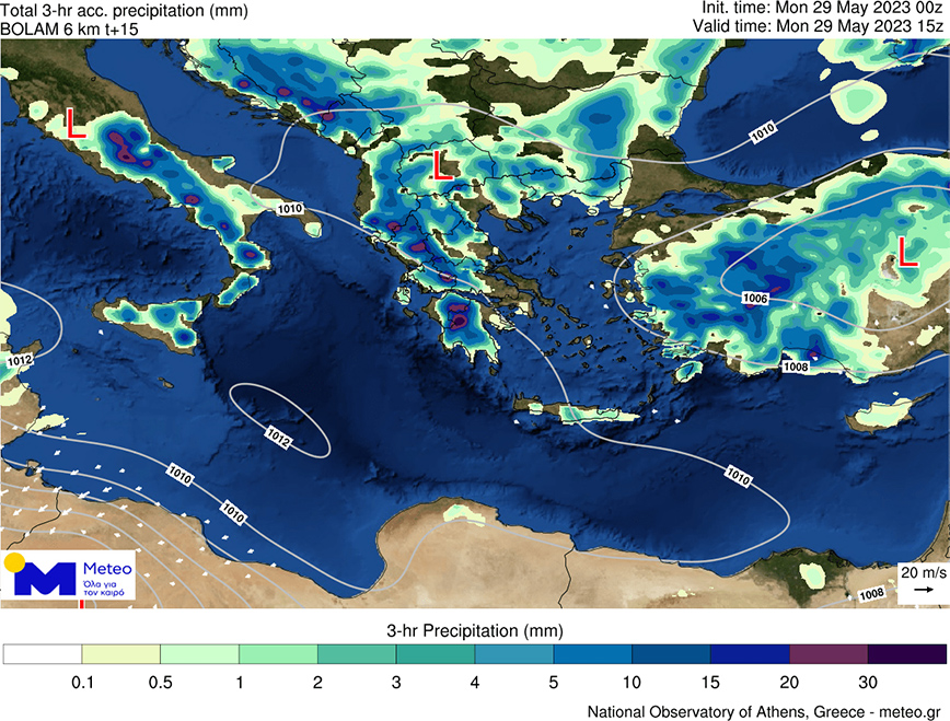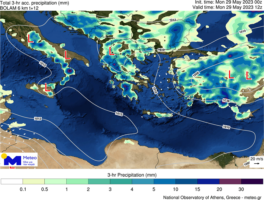 Στους προγνωστικούς χάρτες, αποτυπώνεται η γεωγραφική κατανομή των φαινομένων τα τρίωρα 12:00 – 15:00 και 15:00 – 18:00 (ώρα Ελλάδας) της Δευτέρας 29/05.