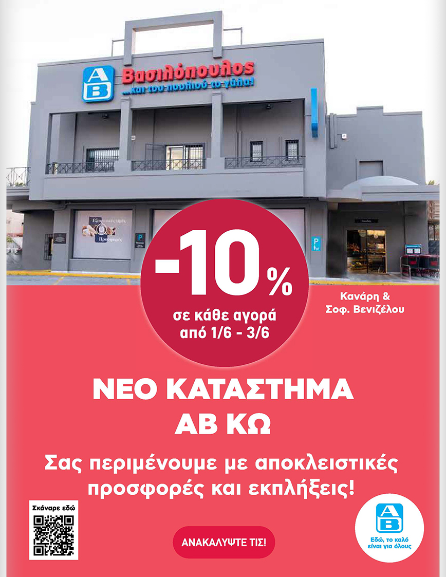 Η ΑΒ Βασιλόπουλος εγκαινιάζει σήμερα το νέο τηςκατάστημα στην Κω και συγκεκριμένα στη συμβολή των οδών Κανάρη & Σοφοκλή Βενιζέλου, επεκτείνοντας περαιτέρω το πανελλαδικό της δίκτυο. Εγκαίνια επίσης πραγματοποιήθηκαν στις 11/5 και στο πρώτο κατάστημα του δικτύου στην Ιεράπετρα, στην επαρχιακή Oδό Ιεράπετρας – Παχειάς Άμμου. Διαχρονικός στόχος της ΑΒ είναι να παρέχει τις υπηρεσίες της σε κάθε γωνιά της χώρας, προσφέροντας υψηλής ποιότητας, ελληνικής προέλευσης, αλλά και απ’ όλο τον κόσμο προϊόντα, καθώς και την καλύτερη εξυπηρέτηση στους πάνω από 2 εκατομμύρια πελάτες της, με τις πιο προσιτές τιμές.