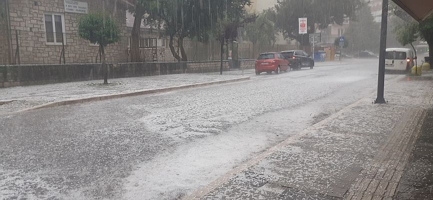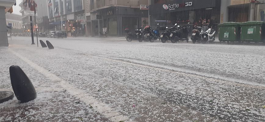 Το χαλάζι έχει μέγεθος φουντουκιού, με αποτέλεσμα οι δρόμοι και τα πεζοδρόμια να δείχνουν χιονισμένα.