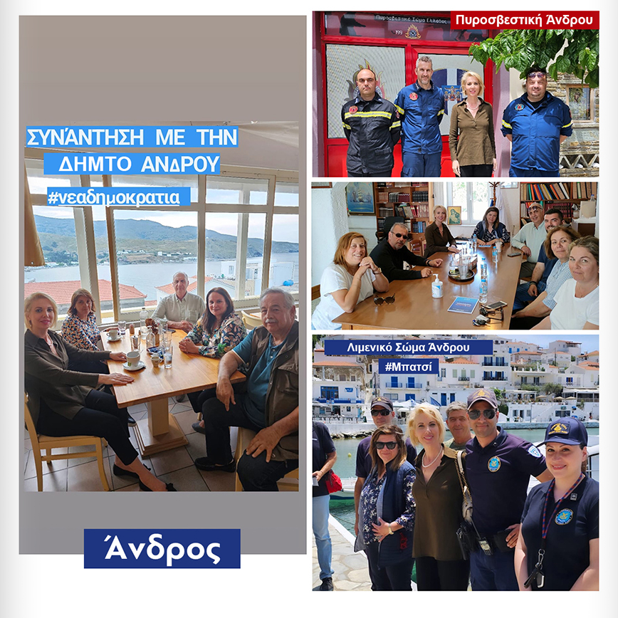 Έπειτα, η Κατερίνα Μονογυιού πραγματοποίησε συνάντηση εργασίας με το Δήμαρχο Άνδρου κ. Δημήτρη Λοτσάρη και ενημερώθηκε για την πορεία των έργων υποδομής στο νησί καθώς και με τα μέλη της ΔΗΜ.Τ.Ο Άνδρου, όπου συζήτησε την εκλογική ετοιμότητα της παράταξης στο δρόμο προς τις καθοριστικές εκλογές της 25ης Ιουνίου. Η Κατερίνα Μονογυιού επισκέφτηκε τα καταστήματα στη Χώρα και στο Κόρθι και συζήτησε με επιχειρηματίες και εργαζόμενους την πορεία της φετινής τουριστικής σεζόν.
