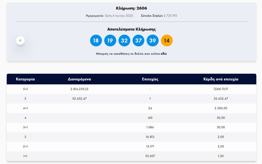 Απόψε, Τρίτη 6 Ιουνίου 2023, στην κλήρωση 2606 του Τζόκερ του ΟΠΑΠ, θα μοιραστούν στους τυχερούς της πρώτης κατηγορίας τουλάχιστον 2.800.000 ευρώ.