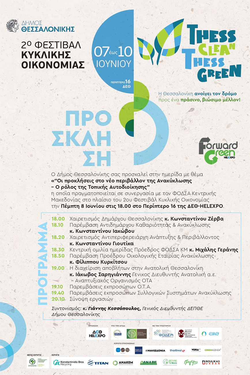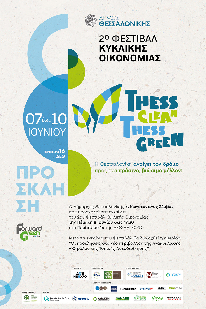 Την Πέμπτη 8 Ιουνίου στις 17.30 θα πραγματοποιηθούν τα επίσημα εγκαίνια του 2ου Φεστιβάλ Κυκλικής Οικονομίας, με τίτλο Thess Clean – Thess Green από τον Δήμαρχο Θεσσαλονίκης Κωνσταντίνο Ζέρβα. Μετά τα εγκαίνια θα διεξαχθεί η ημερίδα «Οι προκλήσεις στο νέο περιβάλλον της Ανακύκλωσης – Ο ρόλος της Τοπικής Αυτοδιοίκησης».
