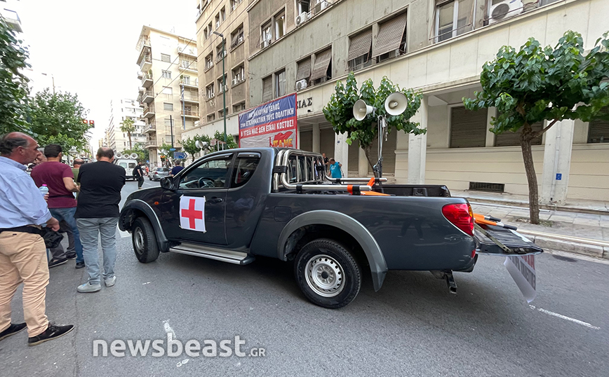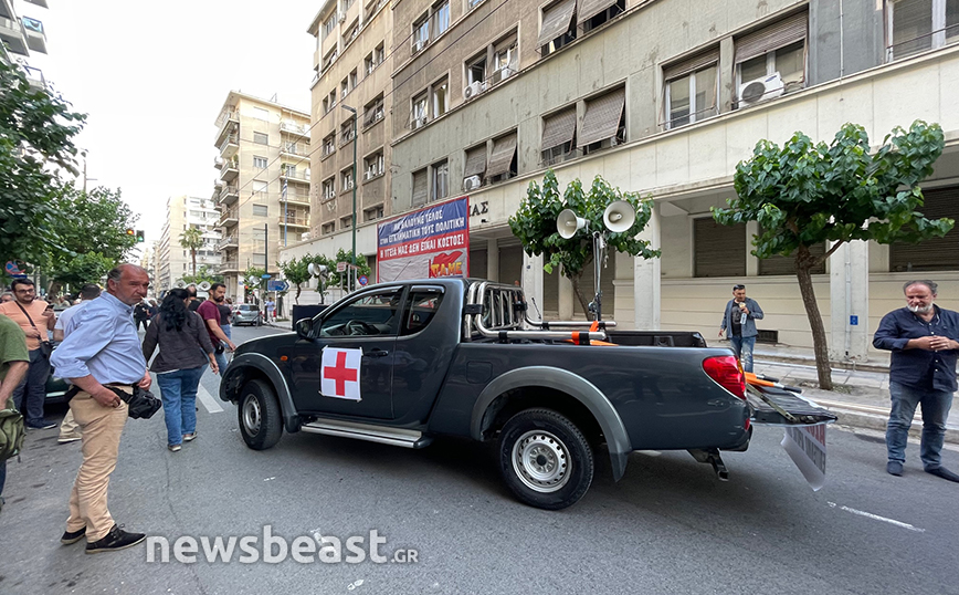 Μάλιστα, ένα φορτηγάκι έχει μετατραπεί σε «ασθενοφόρο», ως ένδειξη διαμαρτυρίας.