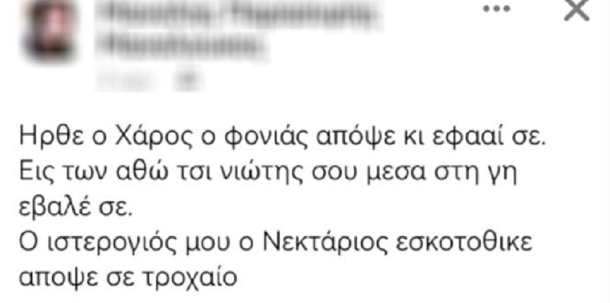 «Ήρθε ο Χάρος ο φονιάς, απόψε και έφαέ σε/ Εις των αθώ τσι νιότης σου, μέσα στη γη έβαλέ σε», έγραψε στο Facebook και πρόσθεσε ότι «ο υστερογιός μου, Νεκτάριος, εσκοτώθηκε απόψε σε τροχαίο».