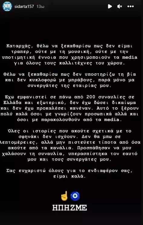 Για τη συμπλοκή που σημειώθηκε κατά τη διάρκεια συναυλίας του σε club της Θεσσαλονίκης τα ξημερώματα της Παρασκευής τοποθετήθηκε ο γνωστός τράπερ Sidarta μέσα από ένα story που έκανε στο Instagram.