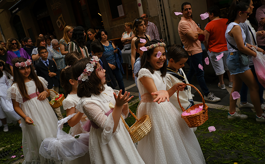 Νέα παιδιά λαμβάνουν μέρος στης λιτανεία του Corpus Christi, στην Παμπλόνα της βόρειας Ισπανίας. Η ημέρα του Corpus Christi, μια αρχαία καθολική παράδοση που λαμβάνει χώρα στην Ισπανία. Πρόκειται για μια γιορτή της Ρωμαιοκαθολικής Εκκλησίας, προς τιμήν της πραγματικής παρουσίας του σώματος του Ιησού Χριστού. Τα παιδιά χαμογελούν, ενώ γιορτάζουν την πίστη τους.