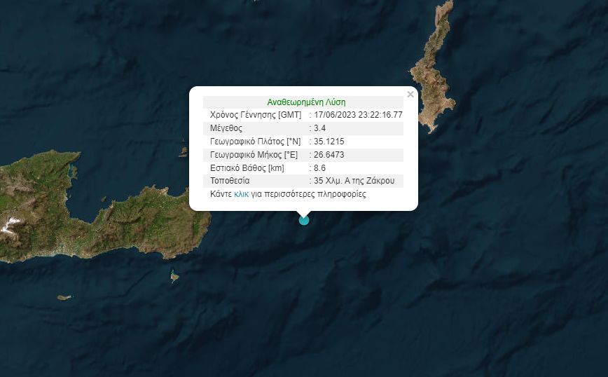 Το επίκεντρο του σεισμού εντοπίζεται στη θαλάσσια περιοχή 35 χιλιόμετρα ανατολικά της Ζάκρου και είχε εστιακό βάθος στα 14,7 χιλιόμετρα.