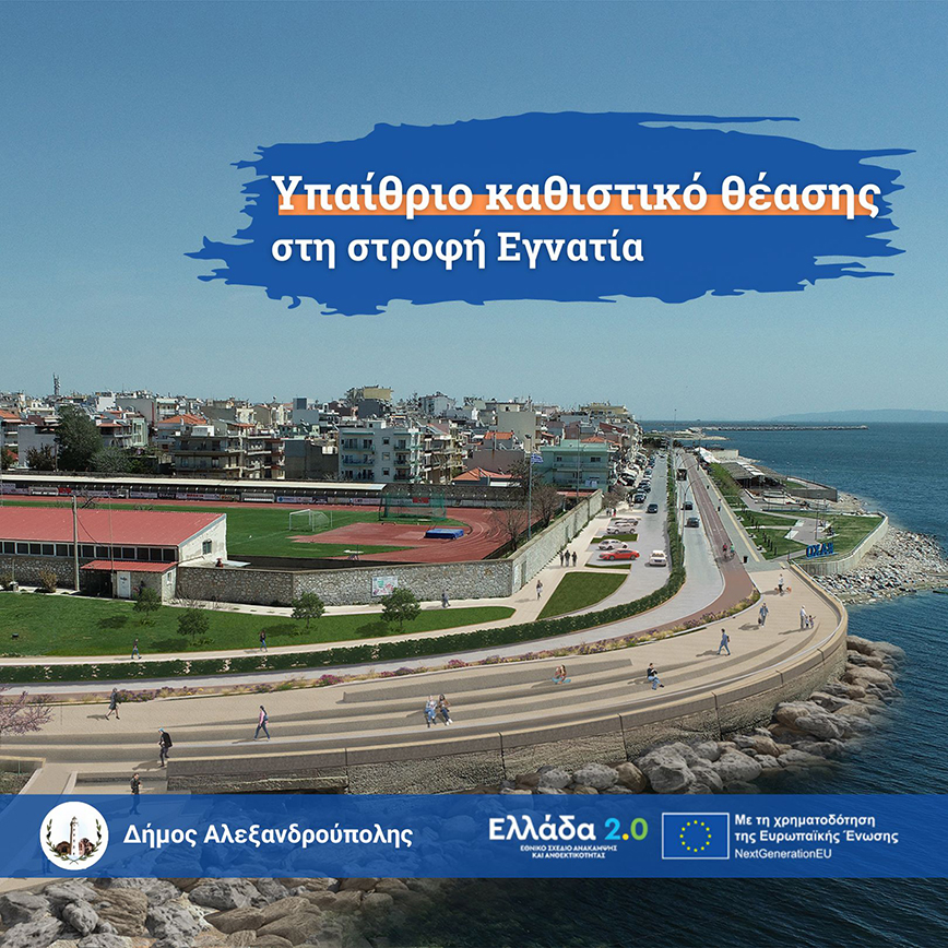 Ειδικότερα προβλέπεται η κατασκευή νέου υπαίθρου θεάτρου εντός του πάρκου Εγνατία (Κηποθέατρο), επέκταση του υφιστάμενου ποδηλατοδρόμου, ανακατασκευή των πεζοδρομίων επί της Έλλης, κατασκευή ομβρίων υδάτων, κατασκευή δύο κόμβων στην είσοδο και έξοδο του λιμανιού, κατασκευή υπαίθριου καθιστικού θέασης στη στροφή Εγνατία και την πολυαναμενόμενη ανακατασκευή και πλήρη ανακαίνιση του δημοτικού θεάτρου Αλεξανδρούπολης.