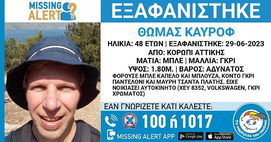 Σε επιφυλακή βρίσκονται οι αρχές λόγω της εξαφάνισης ενός άνδρα ηλικίας 48 ετών γερμανικής καταγωγής τις πρώτες πρωινές ώρες της Πέμπτης από την περιοχή του Κορωπίου. Το «Χαμόγελο του Παιδιού» ενημερώθηκε για το θέμα στις 2 Ιουλίου και προχώρησε στη δημοσιοποίηση των στοιχείων του ενήλικα κατόπιν αιτήματος οικείων προσώπων του, καθώς ενδέχεται να συντρέχουν λόγοι οι οποίοι θέτουν τη ζωή του σε κίνδυνο.