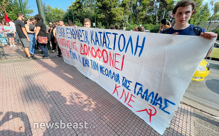 Έξω από τη γαλλική πρεσβεία που βρίσκεται στο κέντρο της Αθήνας πραγματοποιείται συγκέντρωση διαμαρτυρίας, λόγω του θανάτου του 17χρονου Nahel στη Γαλλία.