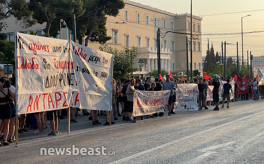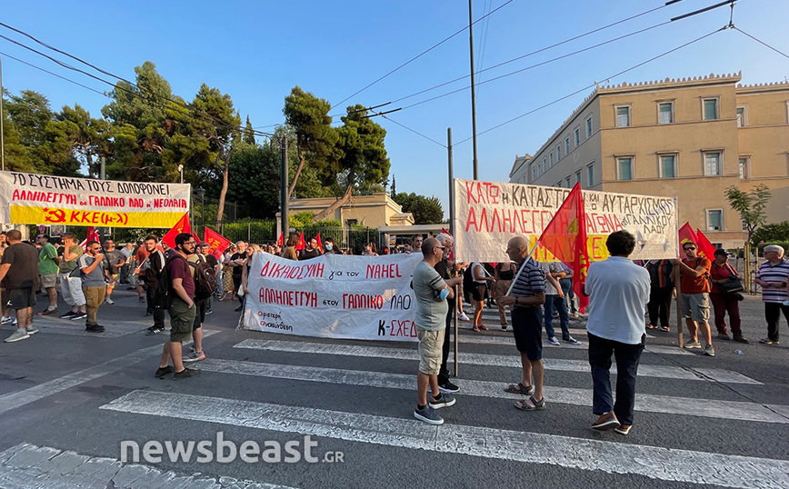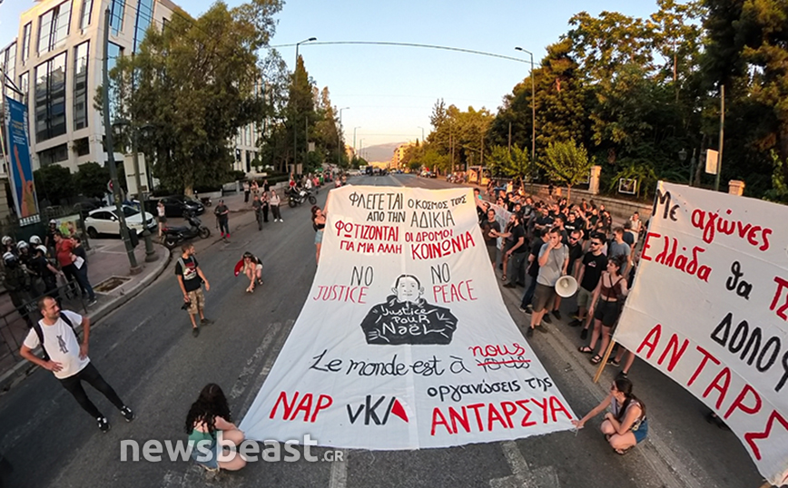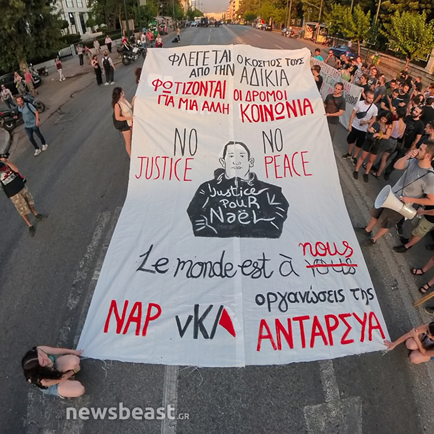 Η συγκέντρωση πραγματοποιείται από την ΚΝΕ, με τον κόσμο να διαμαρτύρεται για τον θανάτου του εφήβου από πυρά αστυνομικού, επειδή δεν συμμορφώθηκε με τις υποδείξεις κατά τη διάρκεια ελέγχου της τροχαίας.