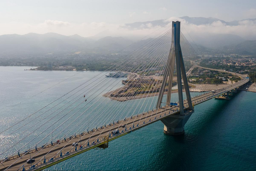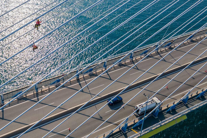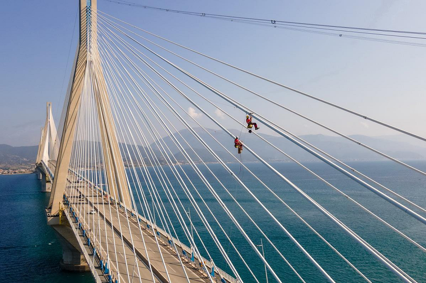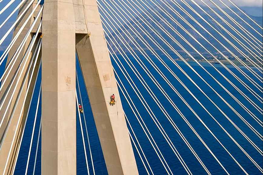 Κόβουν την ανάσα οι φωτογραφίες από τη Γέφυρα του Ρίου-Αντιρρίου, στις οποίες διακρίνονται επτά αλπινιστές από τη Γαλλία να σκαρφαλώνουν στα καλώδια και τους πυλώνες της τεράστιας κατασκευής.