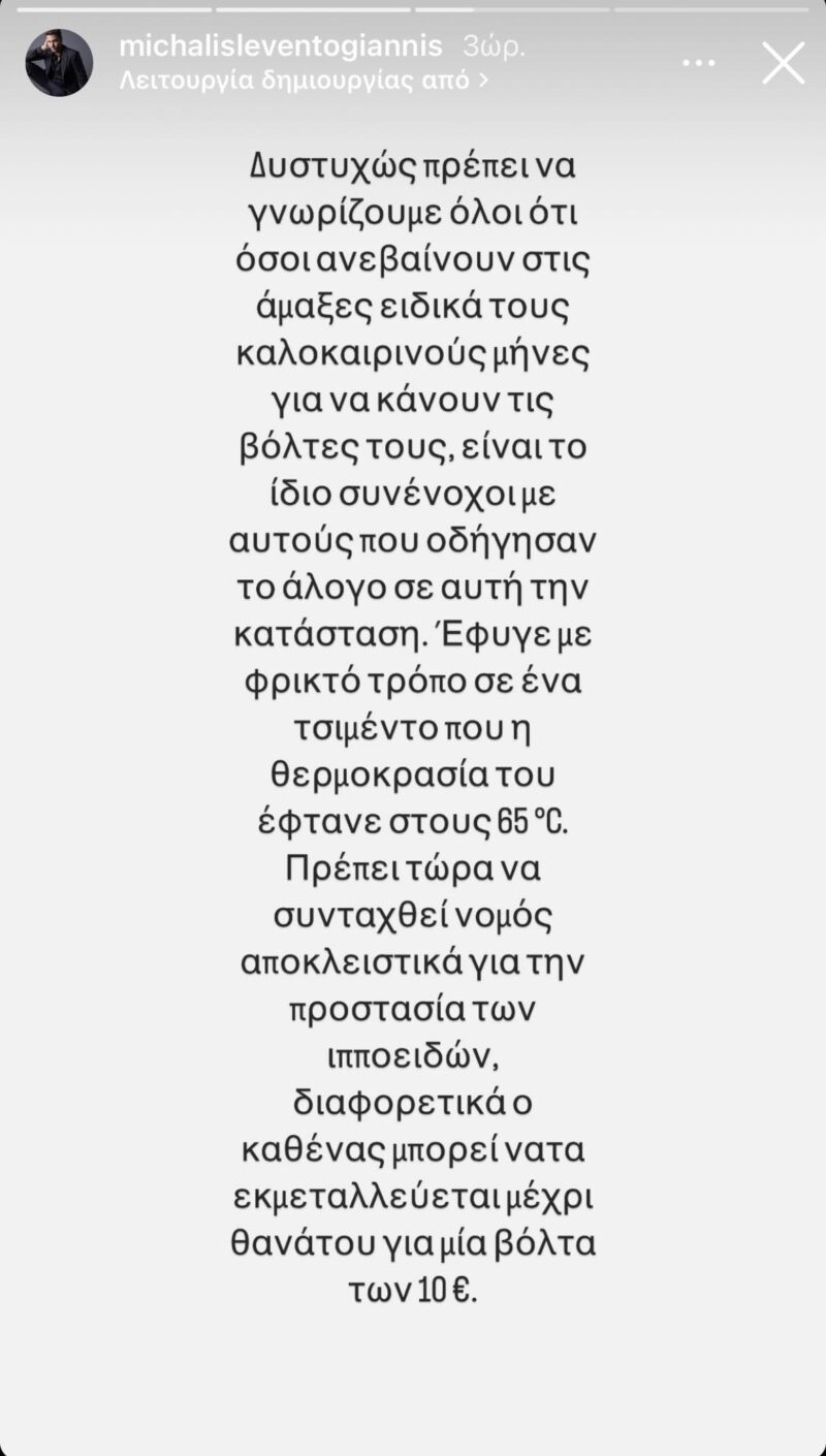 Ο Μιχάλης Λεβεντογιάννης, στο μεταξύ, ο οποίος λατρεύει τα άλογα και όπως έχει παραδεχθεί ένα αναπτύξει μια σχέση ζωής μαζί τους, σημείωσε: «Δυστυχώς πρέπει να γνωρίζουμε όλοι ότι όσοι ανεβαίνουν στις άμαξες ειδικά τους καλοκαιρινούς μήνες για να κάνουν τις βόλτες τους, είναι το ίδιο συνένοχοι με αυτούς που οδήγησαν το άλογο σε αυτή την κατάσταση. Έφυγε με φρικτό τρόπο σε ένα τσιμέντο που η θερμοκρασία του έφτανε στους 65 βαθμούς Κελσίου. Πρέπει τώρα να συνταχθεί νόμος αποκλειστικά για την προστασία των ιπποειδών, διαφορετικά ο καθένας μπορεί να τα εκμεταλλεύεται μέχρι θανάτου για μια βόλτα των 10 ευρώ».