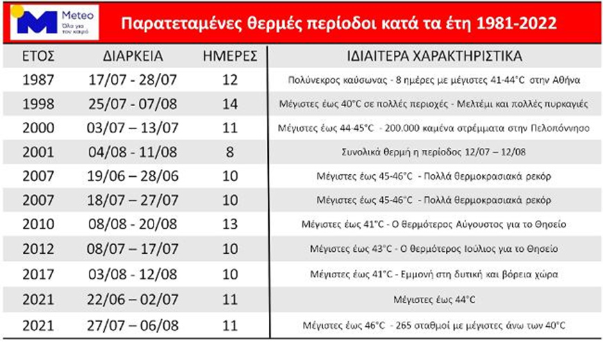 Με αφορμή το επερχόμενο παρατεταμένο θερμό κύμα, παρουσιάζουμε εκ νέου στον πίνακα που ακολουθεί καύσωνες με μεγάλη διάρκεια που εκδηλώθηκαν την περίοδο 1981-2022.