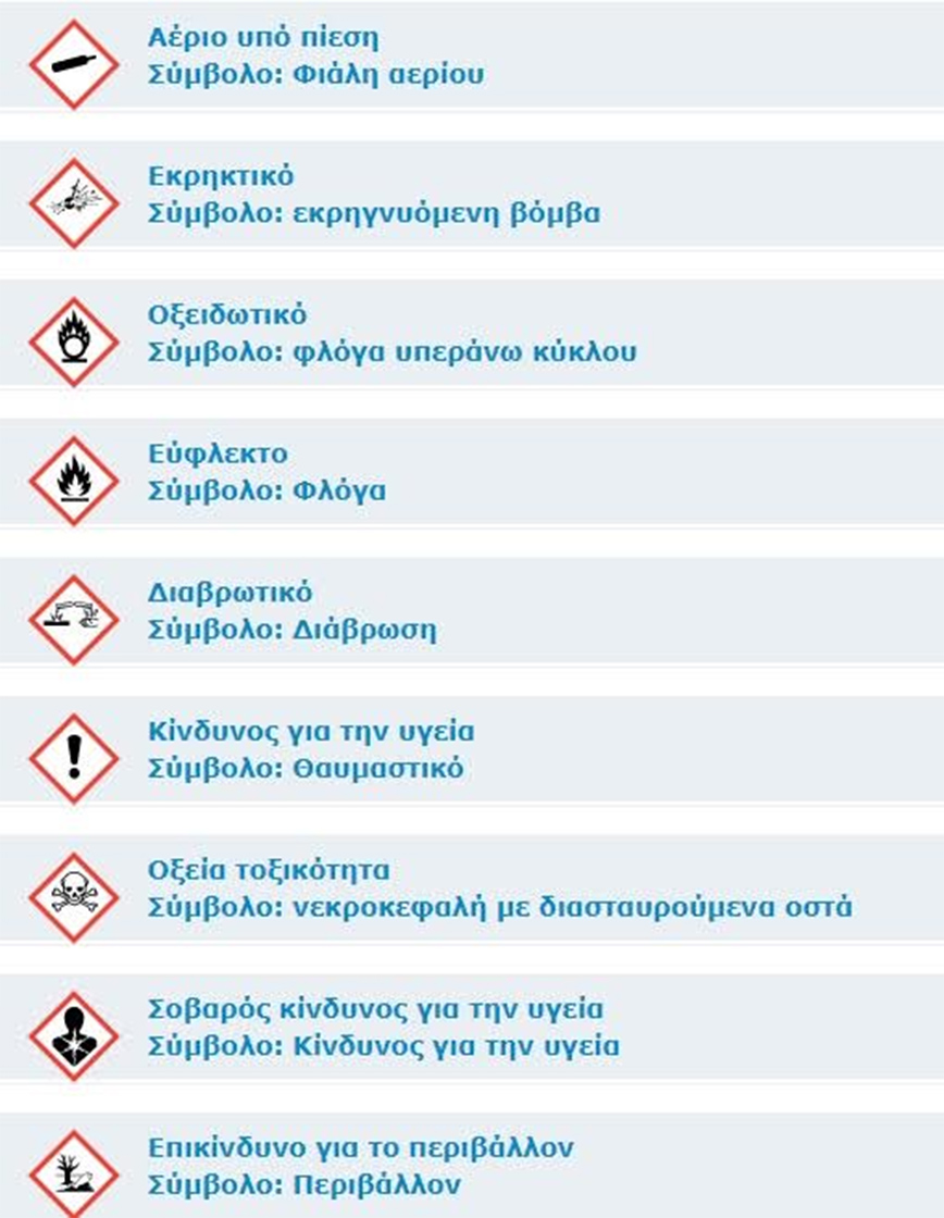 Αφήσαμε για το τέλος τη σημαντικότερη ίσως συμβουλή: Να γνωρίζετε τα επικίνδυνα υλικά με τα οποία έρχεστε σε επαφή ή χρησιμοποιείτε. Κάθε χημικό προϊόν έχει στην ετικέτα του ένα από τα παρακάτω σύμβολα, που έχει ορίσει ο Ευρωπαϊκός Οργανισμός Χημικών Προϊόντων (ΕCHA) της Ευρωπαϊκής Ένωσης και που σας δίνει τις απαραίτητες πληροφορίες για την ορθή χρήση του προϊόντος: