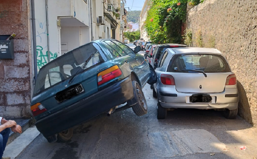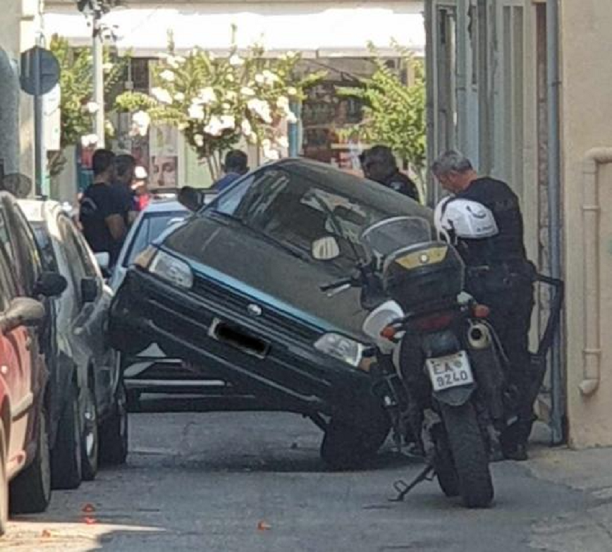 Ένα απίστευτο τροχαίο σημειώθηκε στο Ρέθυμνο, όταν ένας οδηγός επιχείρησε να περάσει από στενή οδό, με αποτέλεσμα το αμάξι του να «καβαλήσει» ένα σταθμευμένο όχημα που βρίσκονταν στο σημείο.
