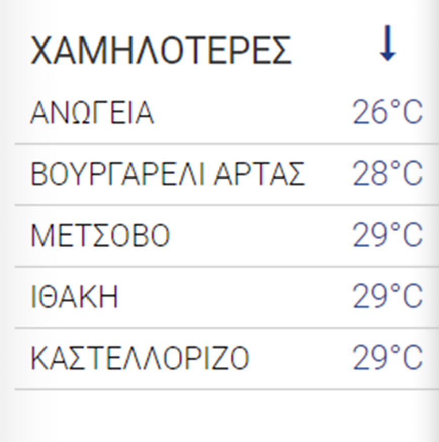 Στον αντίποδα, όσοι ψάχνουν μέρη με περισσότερη δροσιά από θα πρέπει να κατευθυνθούν προς τα νησιά ή τα βόρεια τμήματα της χώρας. Χαρακτηριστικό παράδειγμα των χαμηλότερων τιμών στις θερμοκρασίες για σήμερα, ήταν τα Ανώγεια της Κρήτης, όπου ο υδράργυρος δεν ξεπέρασε τους 26 βαθμούς Κελσίου, αλλά και το Βουργαρέλι Άρτας, όπου εκεί η θερμοκρασία έφτασε τους 28 βαθμούς. Άλλα μέρα με χαμηλές θερμοκρασίες, ήταν το Μέτσοβο, η Ιθάκη και το Καστελλόριζο με 29 βαθμούς Κελσίου.