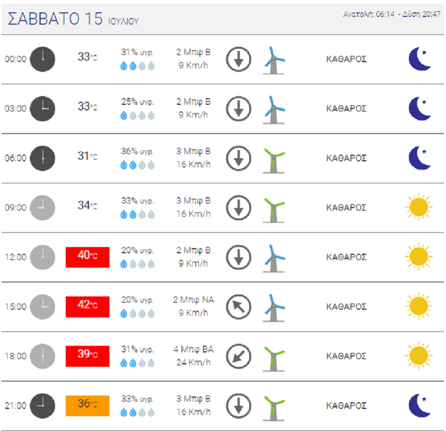 Ωστόσο, στις 12.00 θα αγγίζει τους 40 βαθμούς και στις 15.00 θα φτάσει 42 βαθμούς Κελσίου.