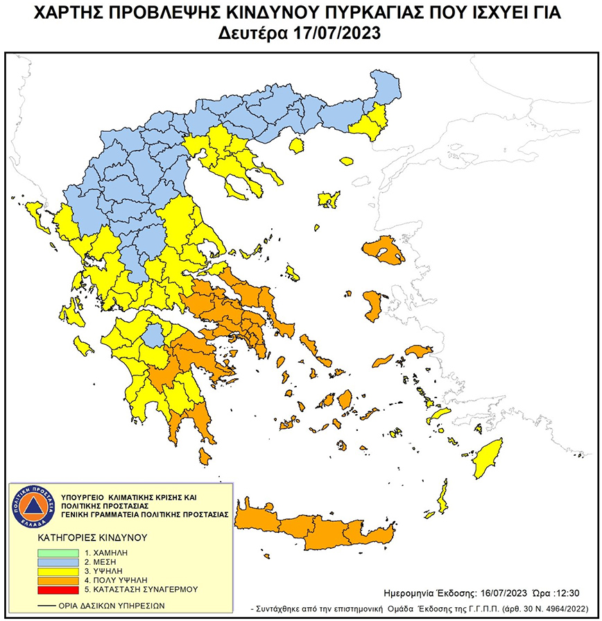 Για πολύ υψηλό κίνδυνο εκδήλωσης πυρκαγιών, προειδοποιεί μέσω του σχετικού της χάρτη η Πολιτική Προστασία, για σήμερα Δευτέρα 17 Ιουλίου. Όπως χαρακτηριστικά επισημαίνει στο «πορτοκαλί» βρίσκονται έξι περιφέρειες της χώρας μεταξύ των οποίων και η Αττική.