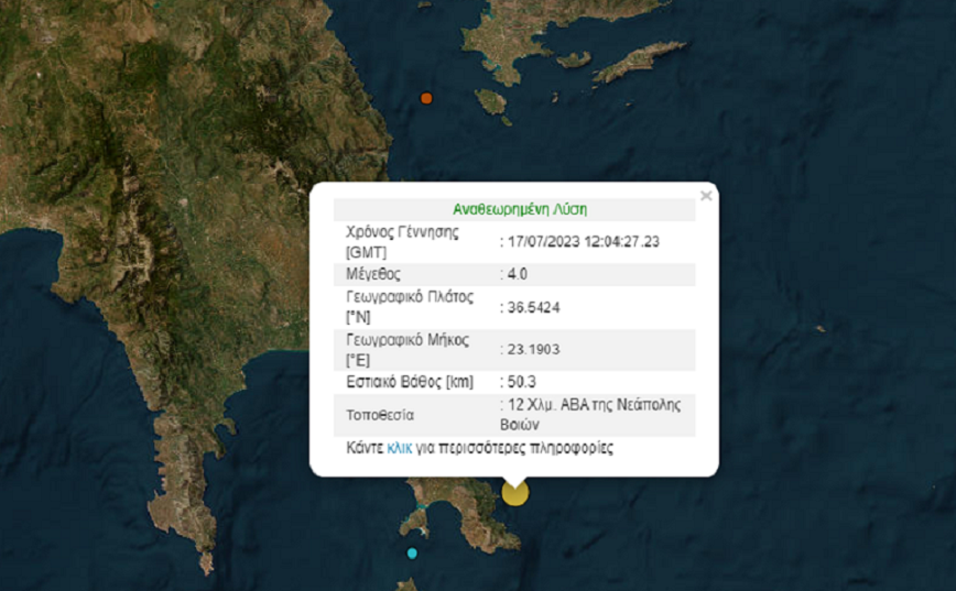 Επίσης, η μέτρηση του Ευρωμεσογειακού Σεισμολογικού Κέντρου, αναφέρει ότι η σεισμική δόνηση είχε μέγεθος 4 βαθμών της κλίμακας Ρίχτερ και το επίκεντρο ήταν 18 χιλιόμετρα νοτιοανατολικά από τη Μονεμβασιά.