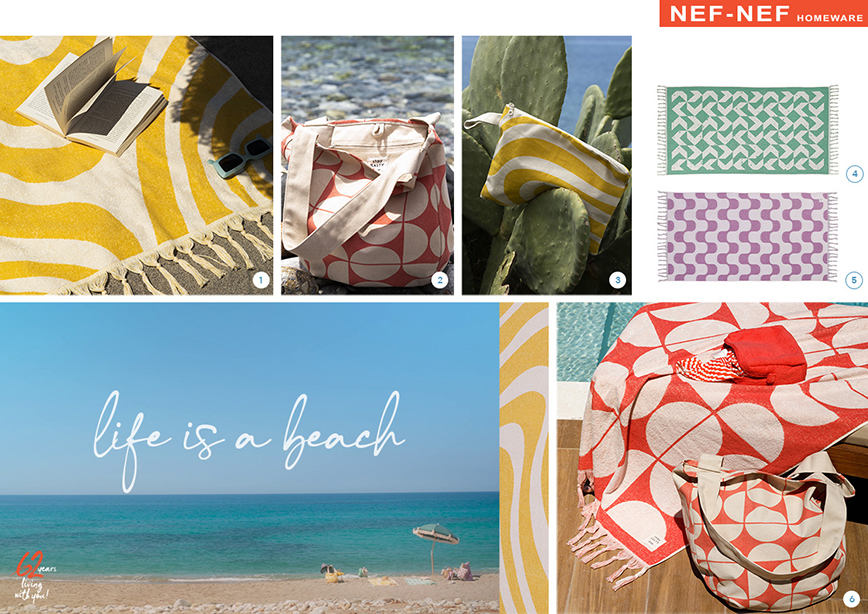 Με έμπνευση το χρώμα και την ξεγνοιασιά του καλοκαιριού, σε μια πλούσια συλλογή που εκφράζει υπέροχα τα διεθνή fashion trends, η νέα Beach Collection της NEF-NEF Homeware προσφέρει τις πιο stylish επιλογές για την παραλία. Highlight, η σειρά με επιρροές από τα 70s, την πιο δημιουργική, απελευθερωτική, ανατρεπτική και ενδιαφέρουσα δεκαετία στον χώρο της μόδας και του design. Άπλετο φως, έντονα χρώματα και γεωμετρικά prints αποτυπώνονται σε πετσέτες από 100% βαμβάκι, τσάντες και νεσεσέρ για total looks και δημιουργικούς συνδυασμούς.
