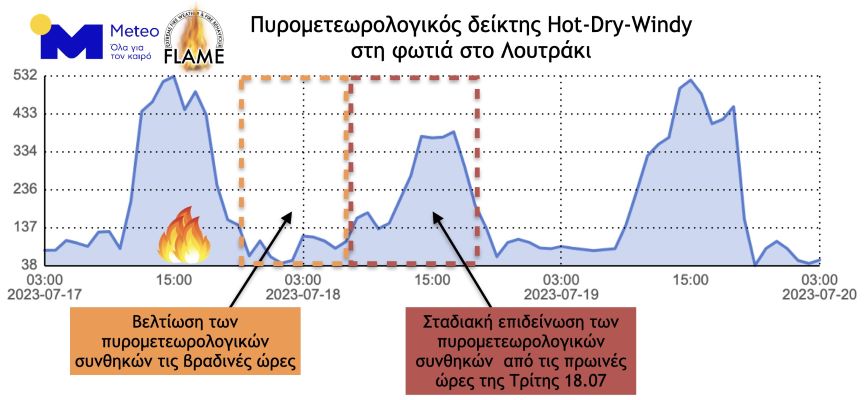 Για επιδείνωση των πυρομετεωρολογικών συνθηκών σε Λουτράκι και Δερβενοχώρια από τις πρωινές ώρες της Τρίτης (18/7) κάνει λόγο η Πυρομετεωρολογική Ομάδα FLAME της μονάδας ΜΕΤΕΟ του Εθνικού Αστεροσκοπείου Αθηνών.