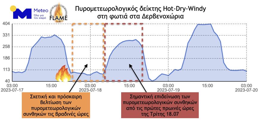 Με βάση τα πιο πρόσφατα προγνωστικά στοιχεία (Εικόνα 1), οι πυρομετεωρολογικές συνθήκες στην περιοχή της πυρκαγιάς στα Δερβενοχώρια, Βοιωτίας αναμένεται να παρουσιάσουν σχετική και πρόσκαιρη βελτίωση κατά τις νυχτερινές ώρες της Δευτέρας 17.07 έως τις πρώτες πρωινές ώρες της Τρίτης 18.07, οπότε και αναμένουμε σταδιακή βελτίωση λόγω της σχετικής εξασθένησης των ανέμων. Θα πρέπει ωστόσο να σημειωθεί πως η ευφλεκτότητα των νεκρών δασικών καυσίμων θα παραμείνει ιδιαίτερα υψηλή και κατά τη διάρκεια των νυχτερινών ωρών (τιμές περιεχόμενης υγρασίας κάτω του 12-13%), γεγονός που αναμένεται να δυσχεράνει τον έλεγχο της φωτιάς. Από τις πρώτες πρωινές ώρες της Τρίτης αναμένεται σημαντική επιδείνωση των πυρομετεωρολογικών συνθηκών η οποία και αναμένεται να κορυφωθεί τις θερμές ώρες της Τρίτης 18.07, οπότε και αναμένουμε ενίσχυση των ανέμων και αύξηση της ευφλεκτότητας των νεκρών δασικών καυσίμων (τιμές περιεχόμενης υγρασίας κάτω του 9%).