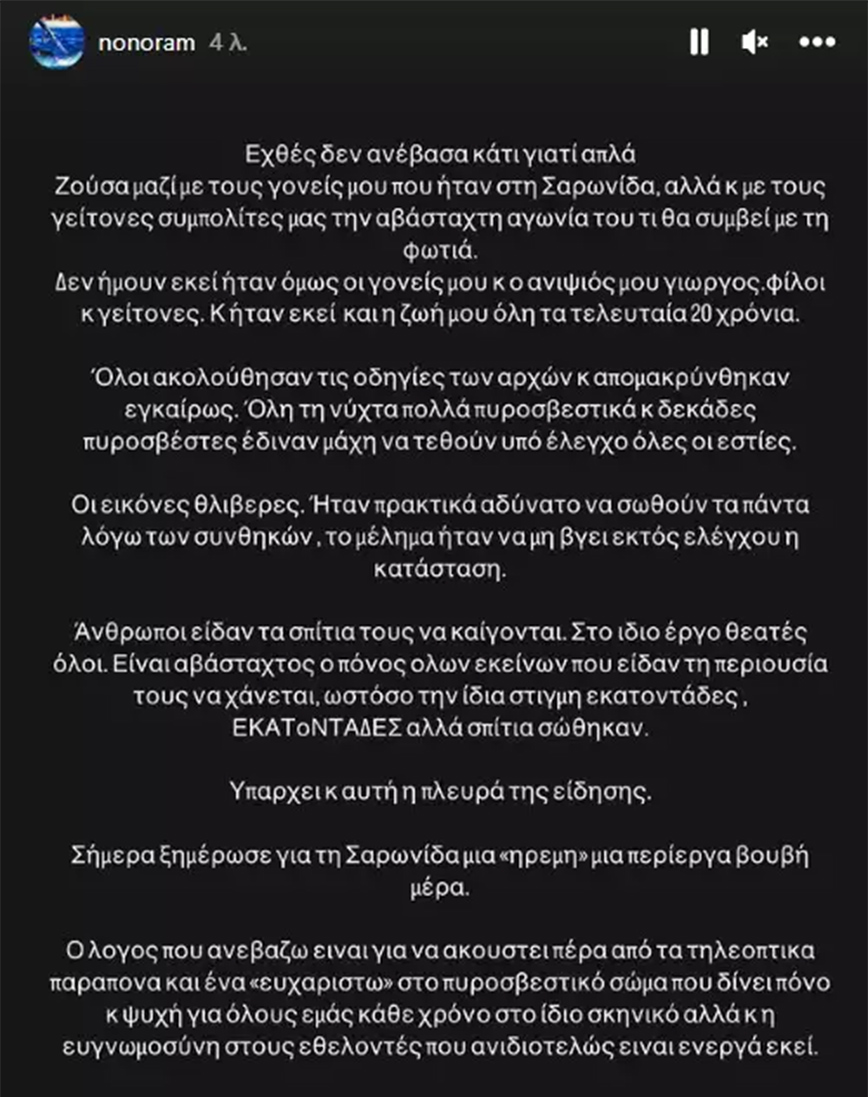 «Εχθές δεν ανέβασα κάτι, γιατί απλά ζούσα μαζί με τους γονείς μου που ήταν στη Σαρωνίδα αλλά και με τους γείτονες συμπολίτες μας την αβάσταχτη αγωνία του τι θα συμβεί με τη φωτιά. Δεν ήμουν εκεί, ήταν όμως οι γονείς μου και ο ανιψιός μου ο Γιώργος, φίλοι και γείτονες. Και ήταν εκεί και η ζωή μου όλη τα τελευταία 20 χρόνια. Όλοι ακολούθησαν τις οδηγίες των Αρχών και απομακρύνθηκαν εγκαίρως. Όλη τη νύχτα πολλά πυροσβεστικά και δεκάδες πυροσβέστες έδιναν μάχη να τεθούν υπό έλεγχο όλες οι εστίες. Οι εικόνες θλιβερές. Ήταν πρακτικά αδύνατο να σωθούν τα πάντα λόγω των συνθηκών, το μέλημα ήταν να μη βγει εκτός ελέγχου η κατάσταση.