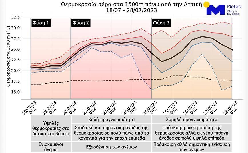 Όπως διακρίνεται και στο γράφημα του Meteo, με βάση την ανάλυση πολλαπλών προγνωστικών σεναρίων για τη θερμοκρασία σε υψόμετρο 1500 μέτρων ενδεικτικά πάνω από την Αθήνα για το διάστημα 18-28 Ιουλίου (Εικόνα 1), αναμένουμε: