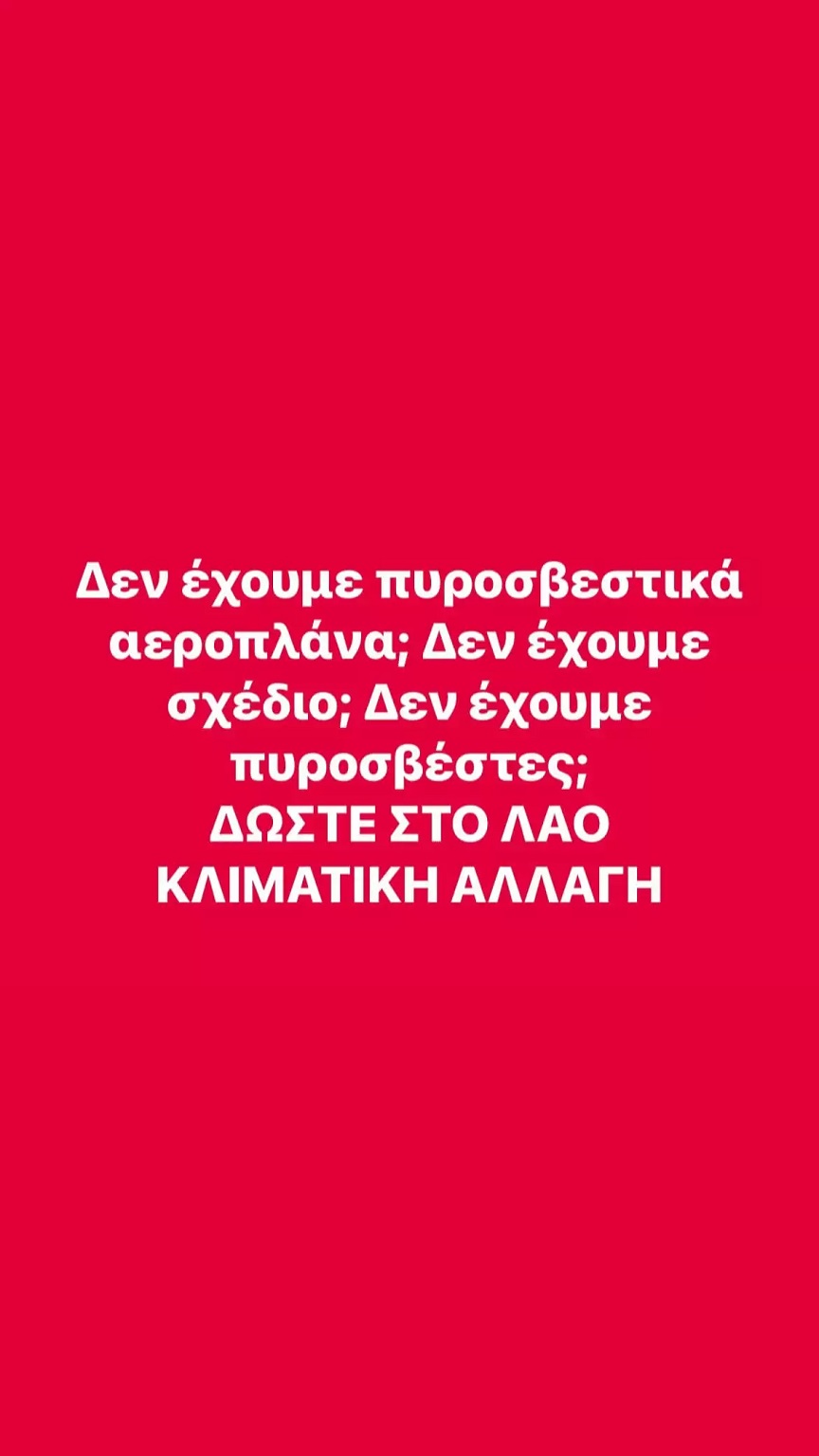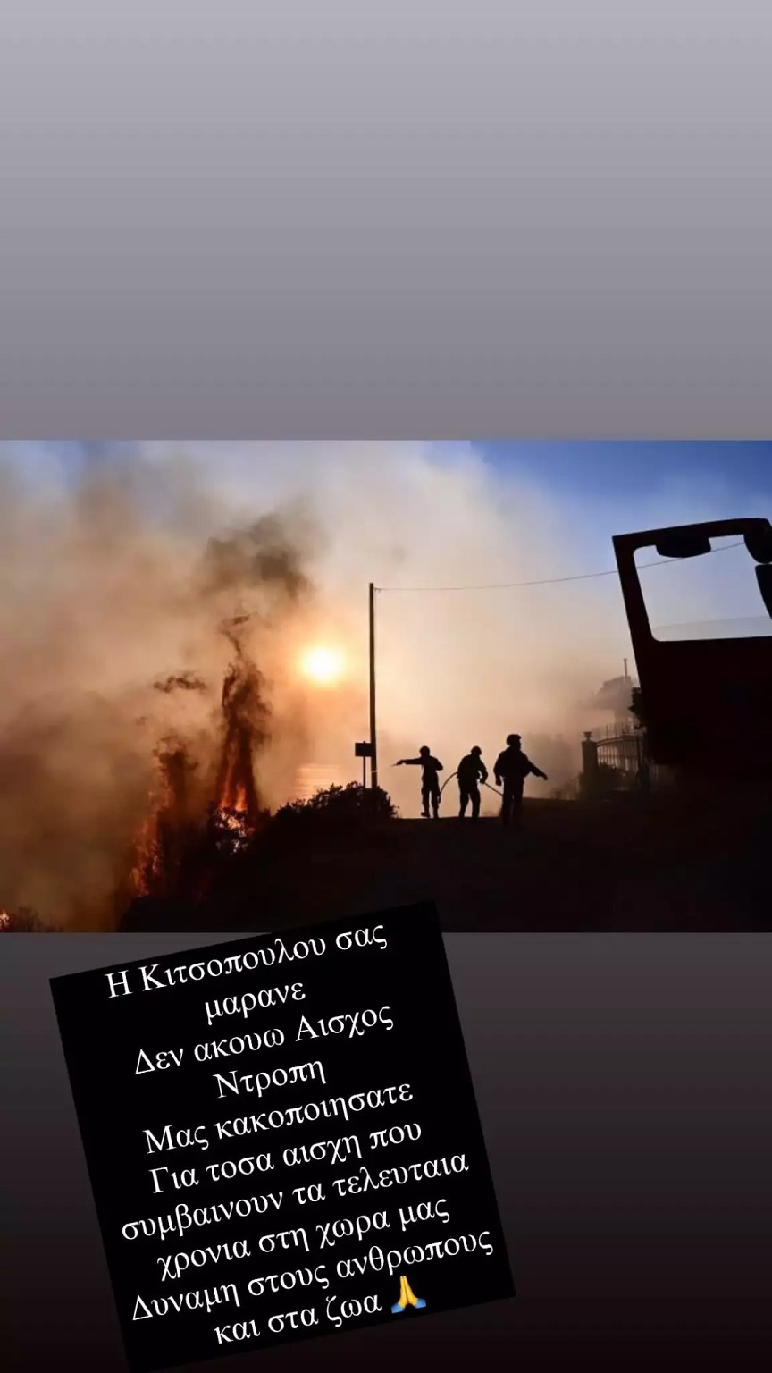«Η Κιτσοπούλου μας μάρανε. Δεν ακούω “αίσχος, ντροπή”. Μας κακοποιήσατε. Για τόσα αίσχη που συμβαίνουν τα τελευταία χρόνια στη χώρα μας. Δύναμη στους ανθρώπους και στα ζώα», έγραψε ο δημοφιλής ηθοποιός σε πρώτο του μήνυμα και έπειτα συνέχισε με δεύτερο, όπου ήταν ιδιαίτερα καυστικος για την διαχείριση των πυρκαγιών από πλευράς της Πολιτείας. «Δεν έχουμε πυροσβεστικά αεροπλάνα; Δεν έχουμε σχέδιο; Δεν έχουμε πυροσβέστες; Δώστε στον λαό κλιματική αλλαγή», σημείωσε χαρακτηριστικά ο Θανάσης Αλευράς.