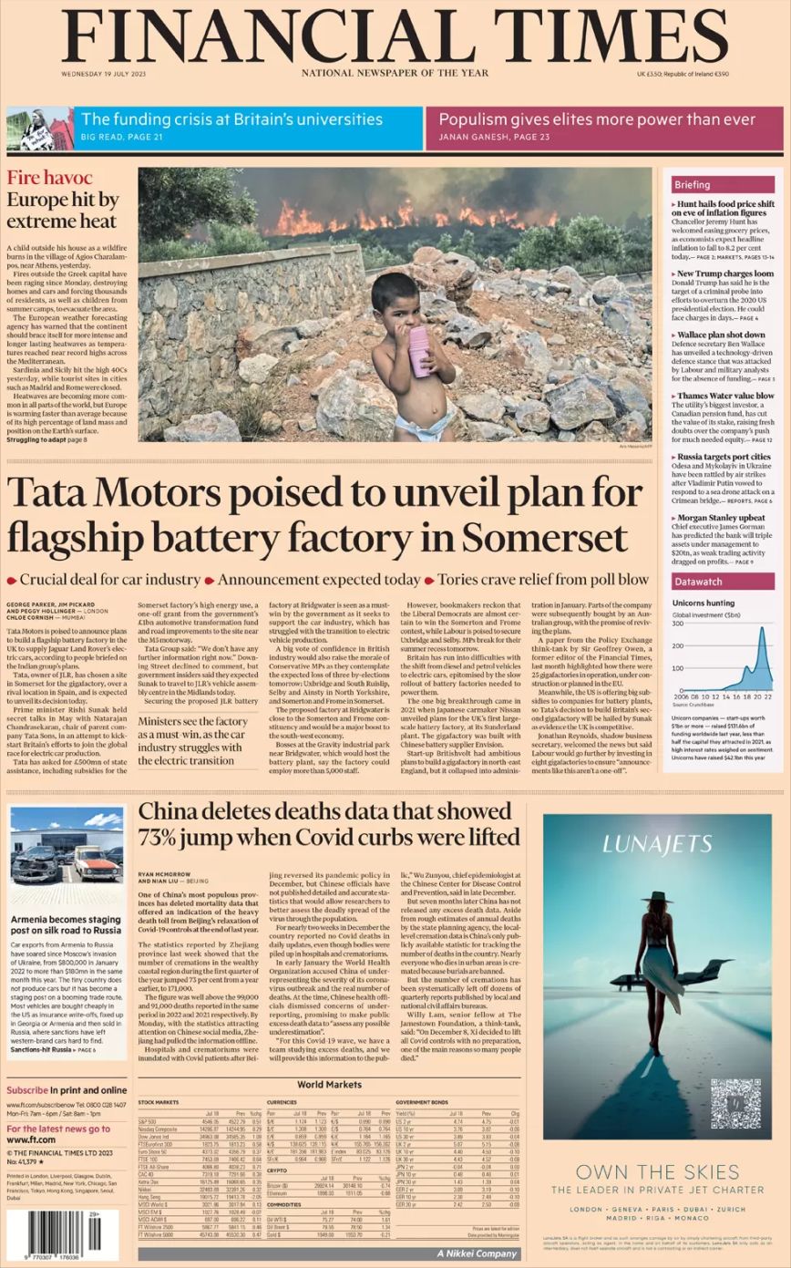 Με ένα μικρό παιδί και τις φλόγες πίσω του και οι Financial Times στο πρωτοσέλιδό τους, που γράφουν πως την Ευρώπη πλήττει ακραία ζέστη.