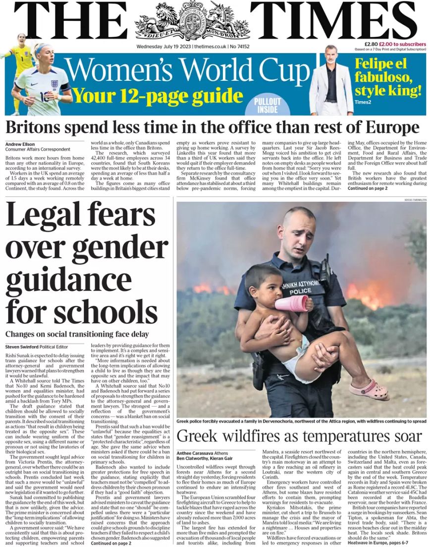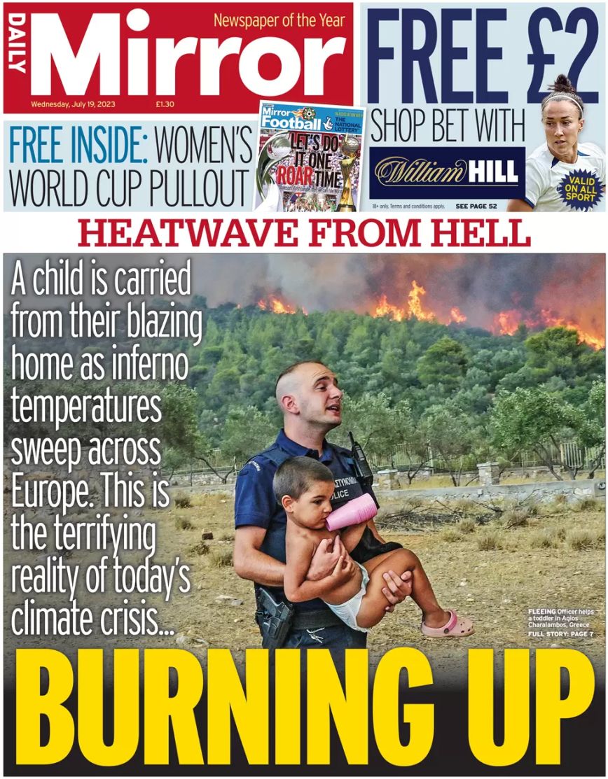 «Αστυνομικός βοηθά μικρό παιδί στον Άγιο Χαράλαμπο στην Ελλάδα» αναφέρει η λεζάντα της Daily Mirror, η οποία γράφει: «Ένα παιδί μεταφέρεται από το φλεγόμενο σπίτι καθώς οι θερμοκρασίες – κόλαση σαρώνουν ολόκληρη την Ευρώπη. Αυτή είναι η τρομακτική αλήθεια της σημερινής κλιματικής κρίσης».