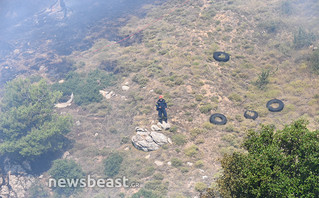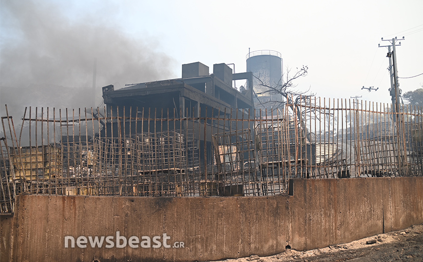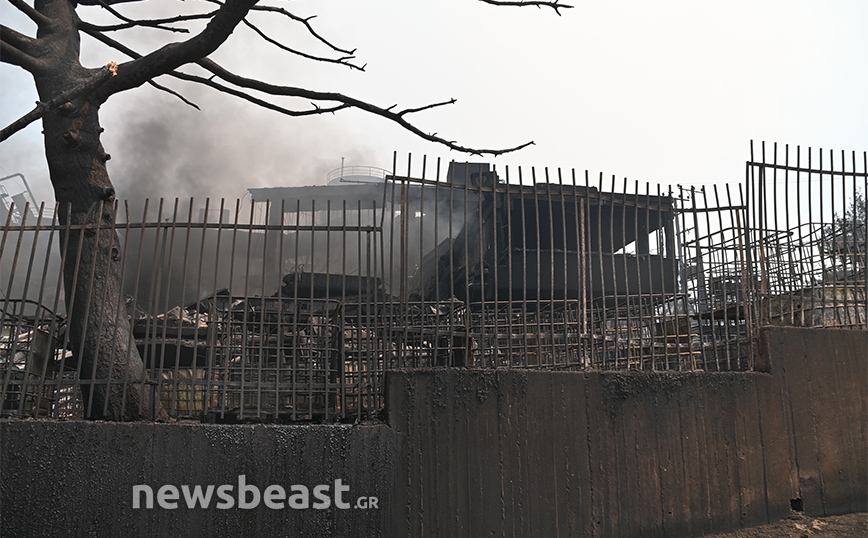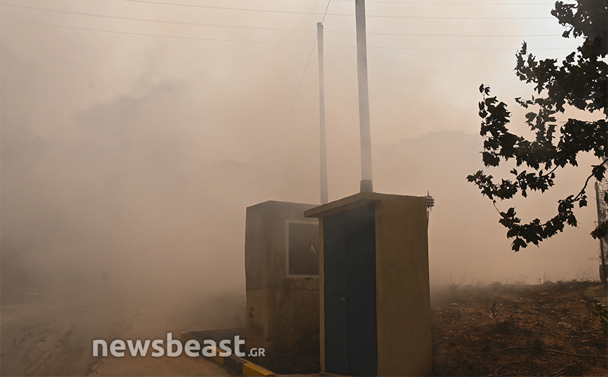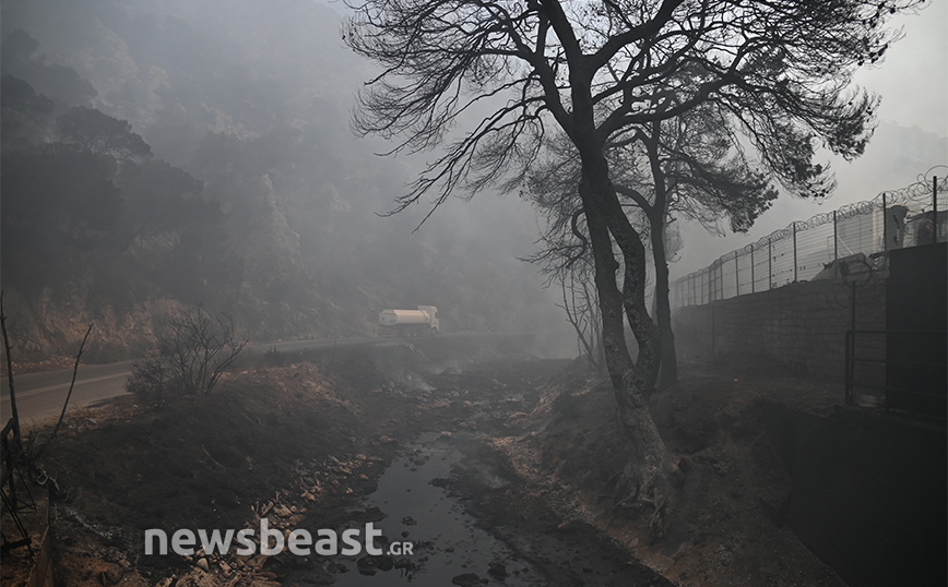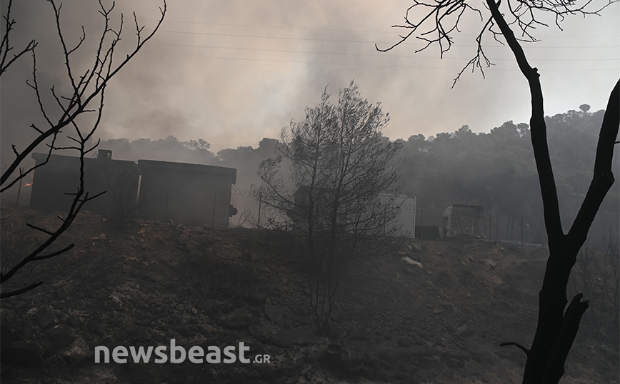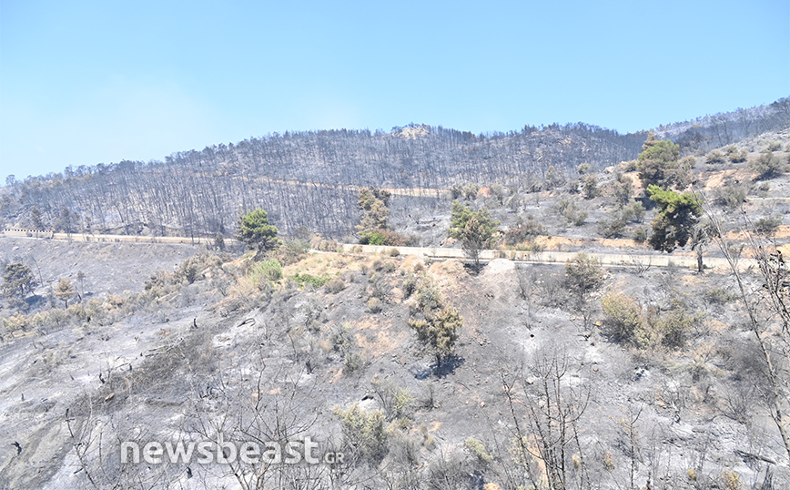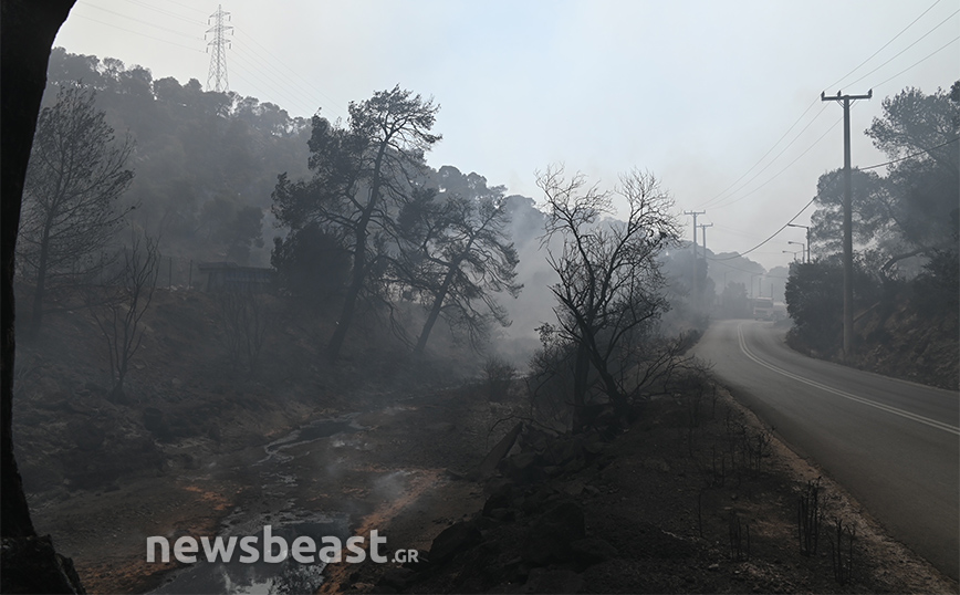 Η ατμόσφαιρα στην περιοχή είναι αποπνικτική και ο ουρανός από τους έντονους καπνούς έχει γίνει γκρι, ενώ τα δέντρα έχουν γίνει όλα κάρβουνο.