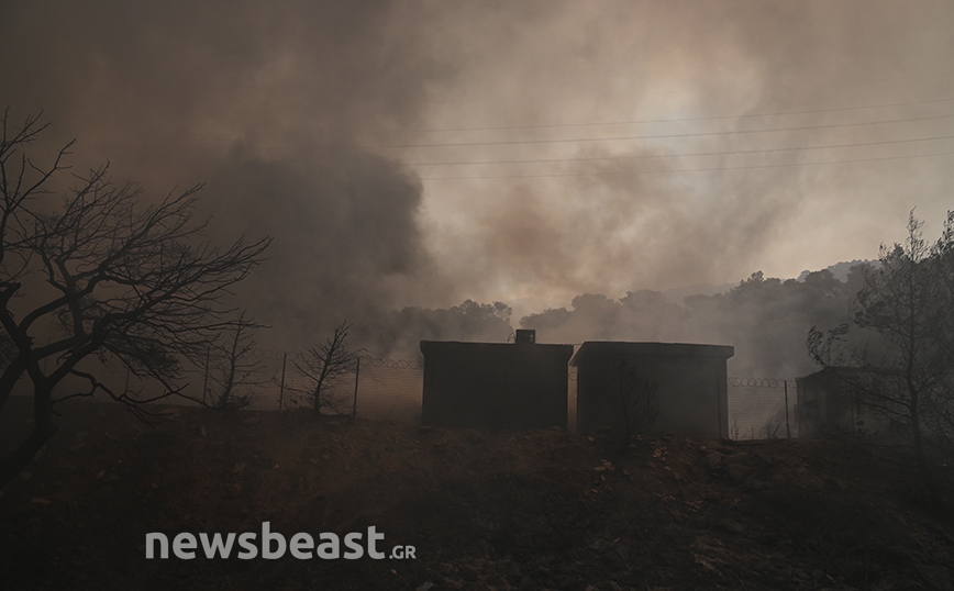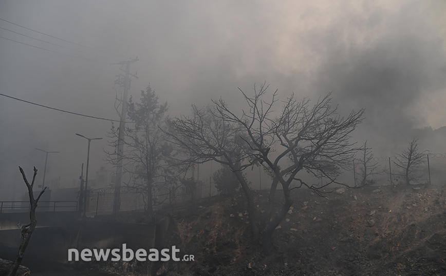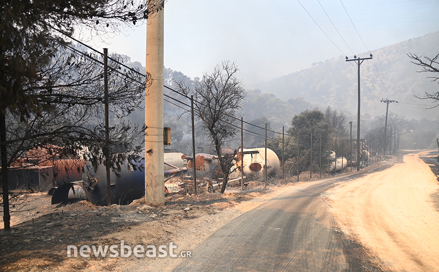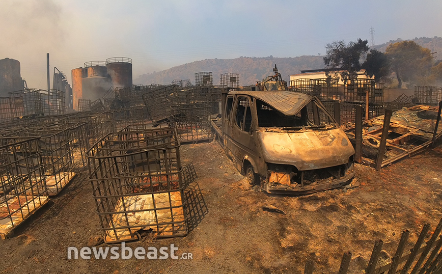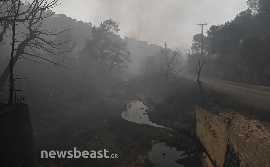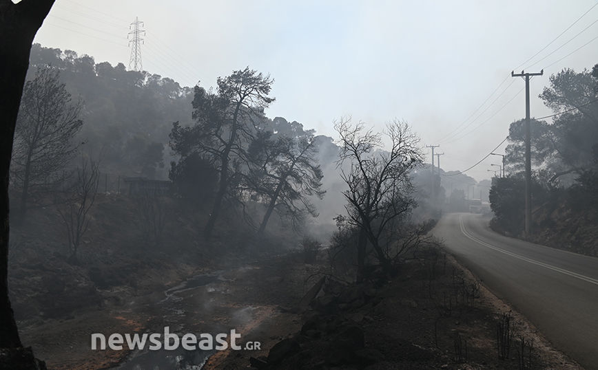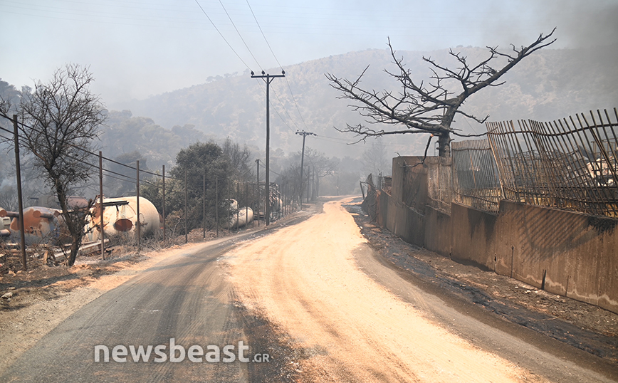 Οι φλόγες «κατάπιαν» ζώα, δέντρα, περιουσίες. Το οδόστρωμα σε κάποια σημεία του μετά βίας διακρίνεται κάτω από τα χώματα που έφερε ο αέρας.