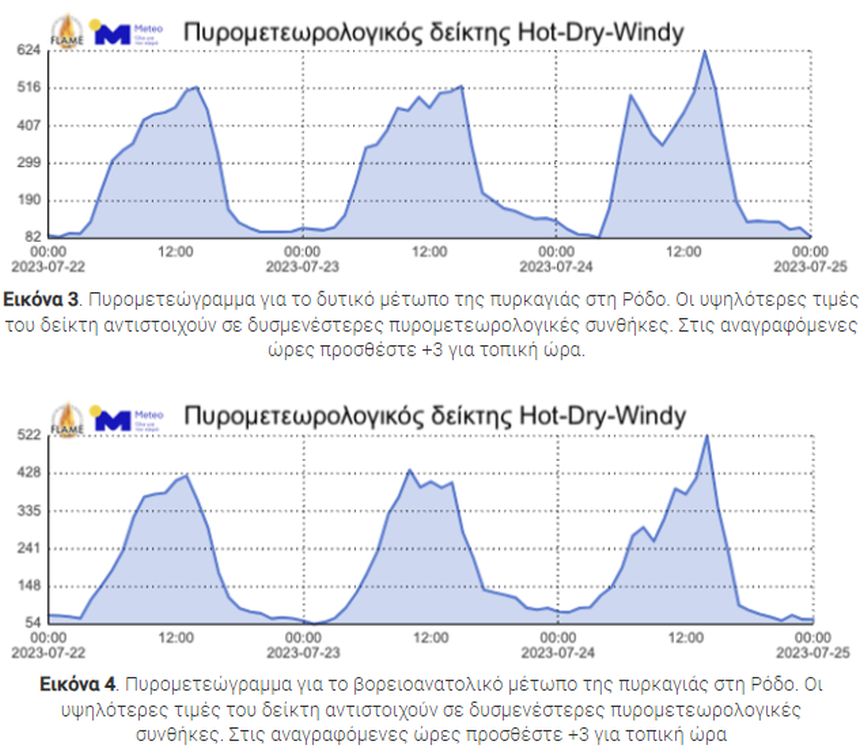 Τέλος, με βάση τα πιο πρόσφατα προγνωστικά στοιχεία της Πυρομετεωρολογικής Ομάδας FLAME του ΜΕΤΕΟ/ΕΑΑ, αναμένεται πρόσκαιρη και μερική βελτίωση των πυρομετεωρολογικών συνθηκών λόγω της σχετικής εξασθένησης των ανέμων. Θα πρέπει ωστόσο να σημειωθεί πως η ευφλεκτότητα των νεκρών δασικών καυσίμων θα παραμείνει ιδιαίτερα υψηλή και κατά τη διάρκεια των νυχτερινών ωρών (τιμές περιεχόμενης υγρασίας κάτω του 9-10%), γεγονός που αναμένεται να δυσχεράνει τον έλεγχο της φωτιάς. Σημαντικό είναι να τονιστεί ότι από τις πρώτες πρωινές ώρες εώς τις μεσημβρινές ώρες της Κυριακής 23.07.2023, στο δυτικό μέτωπο της πυρκαγιάς αναμένεται πρόσκαιρη μεταβολή της διεύθυνσης του ανέμου σε Β/ΒΑ, ενώ μετά τις μεσημβρινές ώρες αναμένουμε εκ νέου στροφή των ανέμων σε Β/ΒΔ διευθύνσεις. Οι πλέον δυσμενείς πυρομετεωρολογικές συνθήκες αναμένονται κατά τις θερμές ώρες (11:00 – 18:00) της Κυριακής 23.07.2023, οπότε και η ένταση των ανέμων θα αυξηθεί με την ευφλεκτότητα να είναι εξαιρετικά υψηλή (τιμές περιεχόμενης υγρασίας κάτω του 7%).