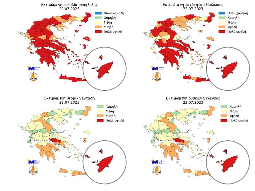 Σχετικά με τη δασική πυρκαγιά στη Ρόδο, η παρακάτω ομάδα χαρτών αναδεικνύει τους λόγους της σημερινής της έκρηξης. Εκτιμώμενη ευφλεκτότητα, ταχύτητα εξάπλωσης, θερμικό φορτίο και δυσκολία ελέγχου είναι σήμερα στο ανώτατο επίπεδο επικινδυνότητας [1]. Αυτή ακριβώς η επιτήρηση των πυρομετεωρολογικών συνθηκών αποτελεί απαραίτητο στοιχείο για την ενίσχυση της ετοιμότητας μας μέσα από την υιοθέτηση επιστημονικά τεκμηριωμένων εργαλείων και υπηρεσιών και την αξιοποίηση επιστημονικής γνώσης αιχμής.