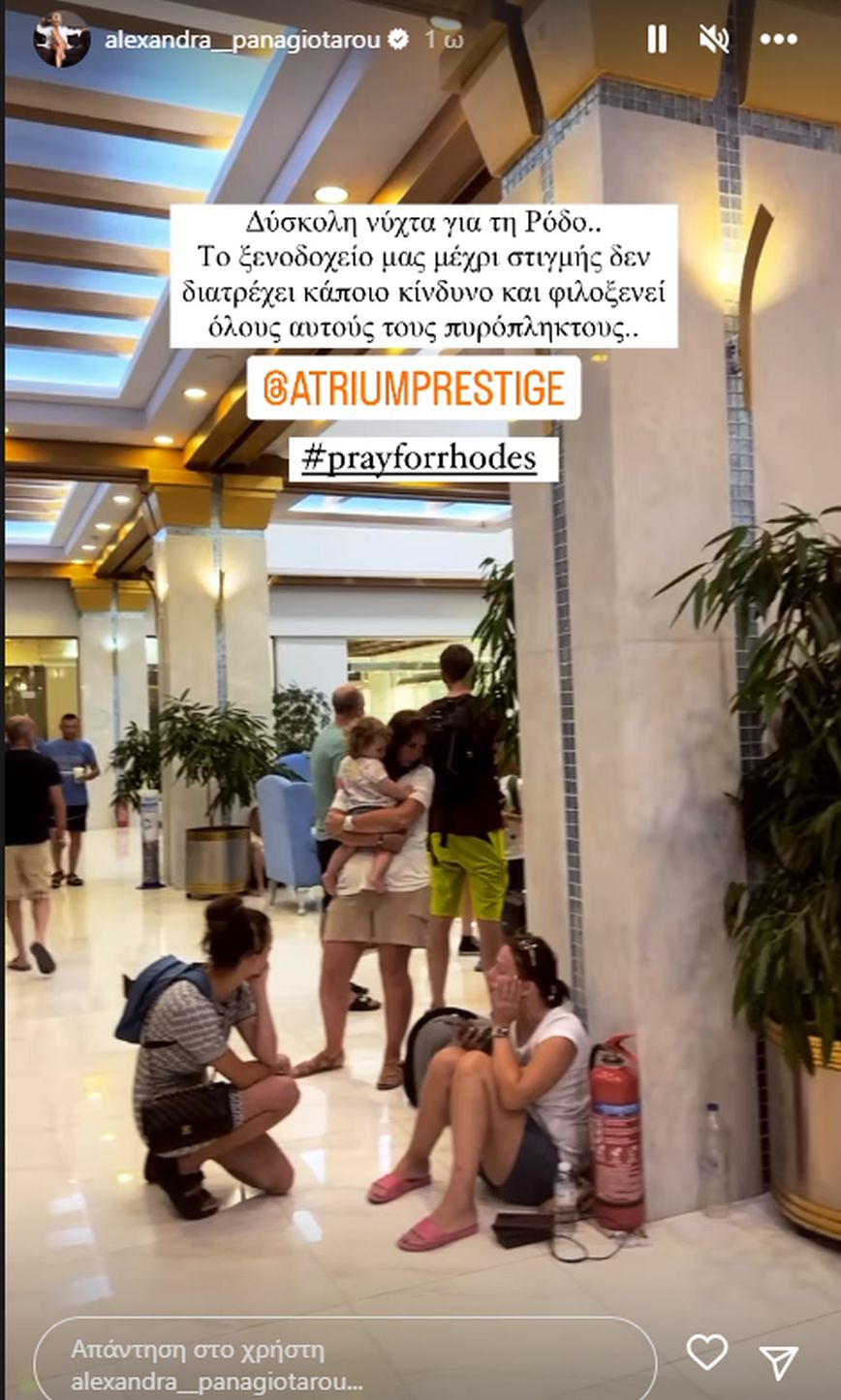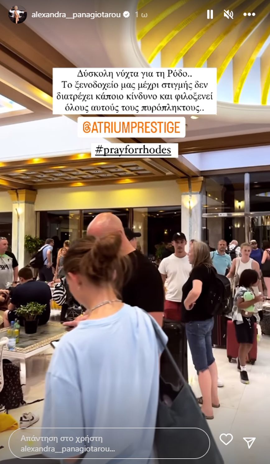 «Δύσκολη νύχτα για τη Ρόδο. Το ξενοδοχείο μας μέχρι στιγμής δεν διατρέχει κάποιο κίνδυνο και φιλοξενεί όλους αυτούς τους πυρόπληκτους», γράφει η Αλεξάνδρα Παναγιώταρου.