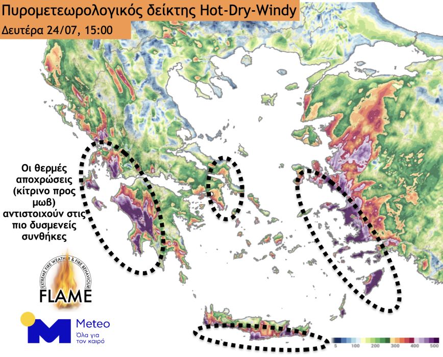 Την ίδια ώρα, σύμφωνα με το meteo, tα νεότερα προγνωστικά στοιχεία υποδεικνύουν διατήρηση της ακραίας επικινδυνότητας για εκδήλωση και εξάπλωση δασικών πυρκαγιών και τη Δευτέρα 24.07 ως αποτέλεσμα της επικράτησης εξαιρετικά δυσμενων πυρομετεωρολογικά συνθηκών. Οι ακραίες πυρομετεωρολογικές συνθήκες που αναμένονται τη Δευτέρα 24.07 οφείλονται στο συνδυασμό των πολύ θερμών και ξηρών συνθηκών καθώς και των ενισχυμένων βόρειων ανέμων.