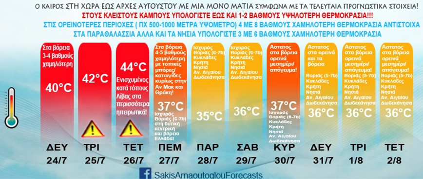 Σύμφωνα με όλα τα διαθέσιμα προγνωστικά στοιχεία την Τρίτη 25-7-2023 και την Τετάρτη 26-7-2023 αναμένονται και πάλι πολύ υψηλές θερμοκρασίες στη χώρα. Οι μέγιστες τιμές θα φθάσουν στα ηπειρωτικά τους 42 με 44 βαθμούς Κελσίου.