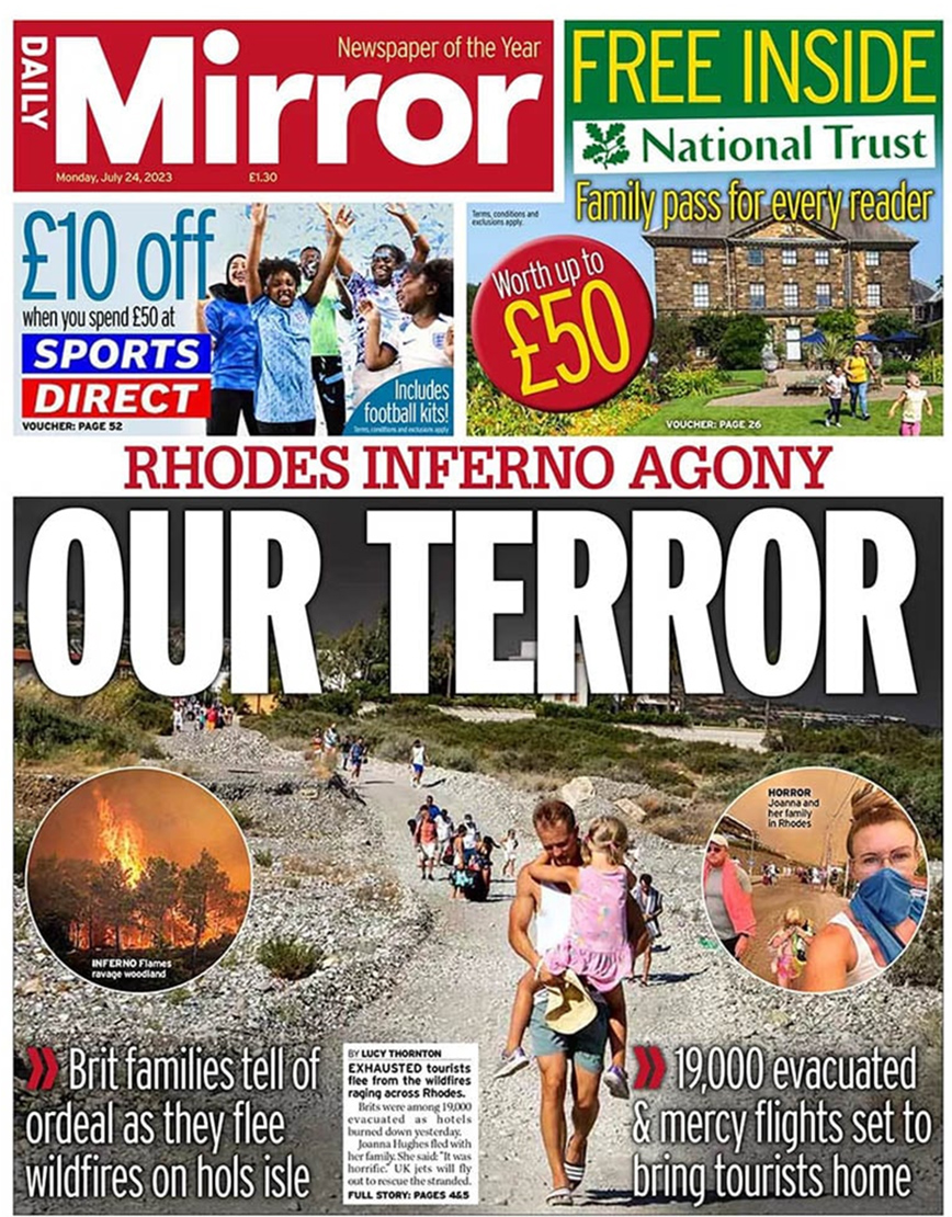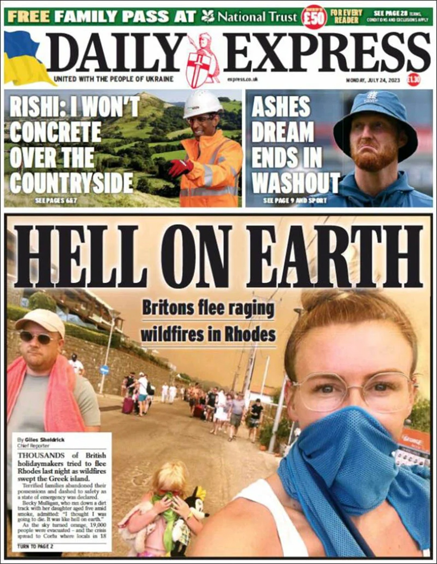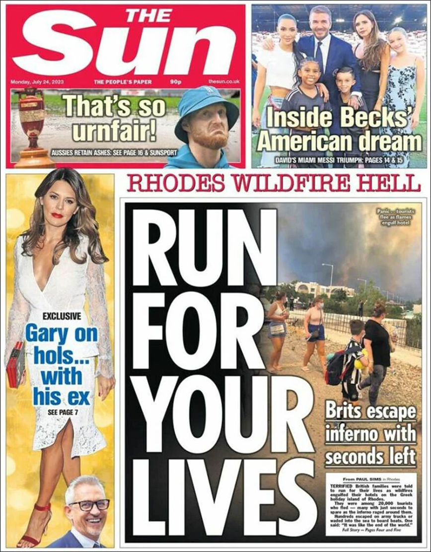 Η μεγάλη φωτιά στη Ρόδο που κατακαίει τα πάντα στο πέρασμά της έχει γίνει φυσικά πρώτο θέμα στα βρετανικά ταμπλόιντ, καθώς στο νησί βρίσκονται χιλιάδες τουρίστες. Τα πρωτοσέλιδα ωστόσο περιγράφουν με γλαφυρό τρόπο να όσα συμβαίνουν στο «νησί των Ιπποτών».