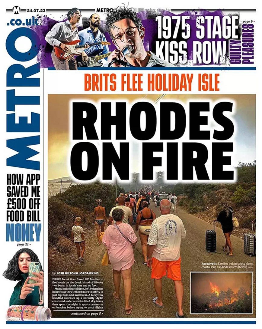 Η Metro σημειώνει: «H Ρόδος στις φλόγες» και το από την πλευρά του φιλοξενεί μαρτυρίες τουριστών που αποκαλύπτουν τις εικόνες αποκάλυψης στο νησί, ενώ αναφέρουν τους τρόπους με τους οποίους απομακρύνθηκαν από τα ξενοδοχεία τους.